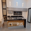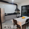 Área gourmet com pia em mármore, mesa com 6 cadeiras, móveis planejados, cooktop de 5 bocas, geladeira e churrasqueira.