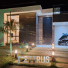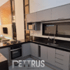Cozinha totalmente equipada com armários planejados, micro-ondas, cooktop de 6 bocas, forno elétrico, bancadas e pia em mármore, além de utensílios completos (panelas, talheres, copos, formas, liquidificador e tapaweres).